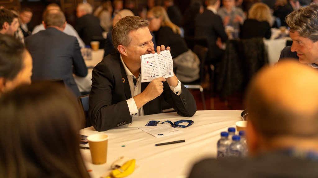 Herefter drøftede de 100 deltagere samme spørgsmål i grupper, og de mange input med alt fra forslag om tinder app til cases til forbedring af SMV’ernes vilkår og at gøre det mere attraktivt at investere i forskning blev samlet i en fælles konference-padlet.