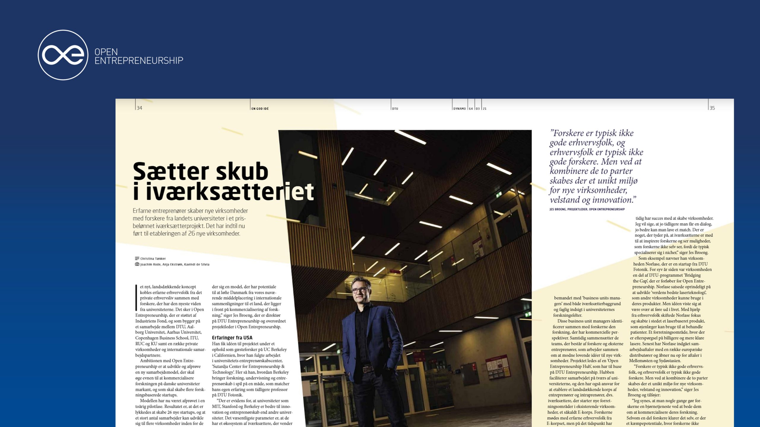 30 March 2021. Artikel fra DTUs magasin Dynamo af Christina Tækker. Erfarne entreprenører skaber nye virksomheder med forskere fra landets universiteter i et prisbelønnet iværksætterprojekt. Det har indtil nu ført til etableringen af 26 nye virksomheder. Ambitionen med Open Entrepreneurship er at udvikle og afprøve en ny samarbejdsmodel, der skal øge evnen til at kommercialisere …