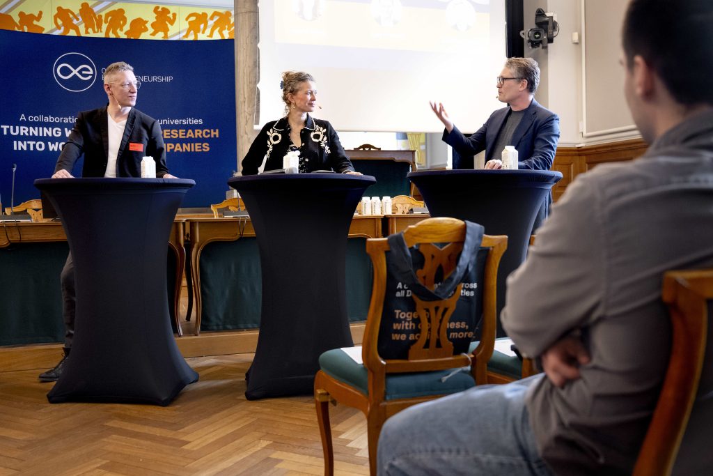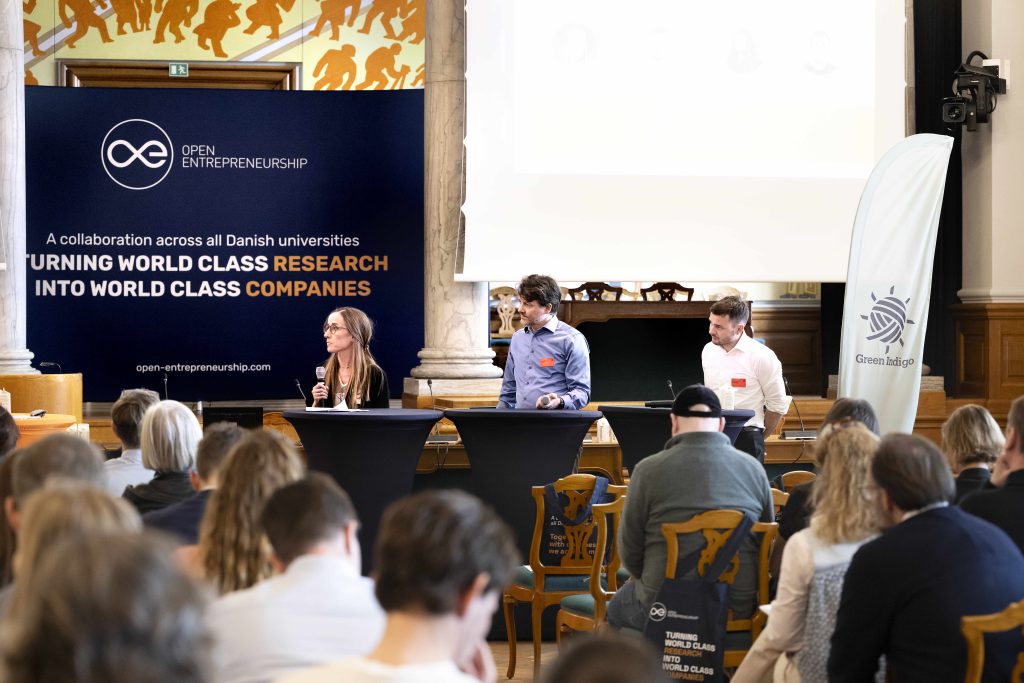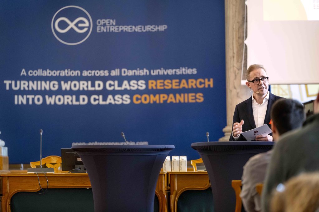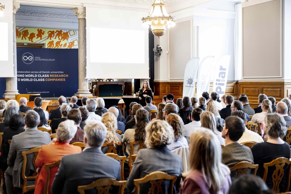 Næste punkt var en keynote ved lektor og vicedirektør på DTU Entrepreneurship, Theresa Norn, med fokus på, hvordan OE har udviklet sig fra et projekt i 2017 til en national platform for innovation på tværs af alle danske universiteter. Et netværk, hvor forskere, entreprenører og eksterne partnere samarbejder om at udvikle nye virksomheder og løsninger baseret på forskning.
